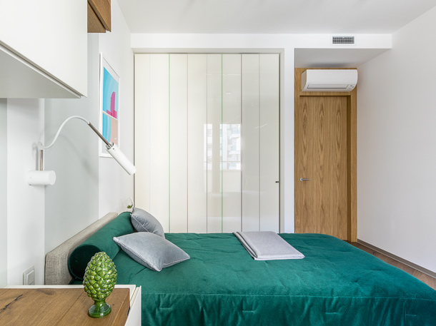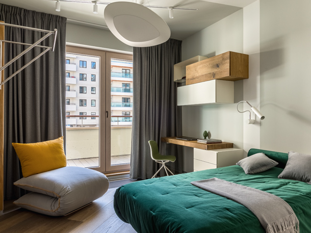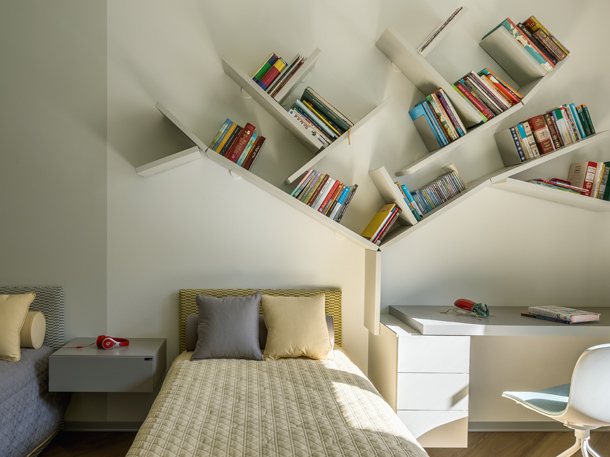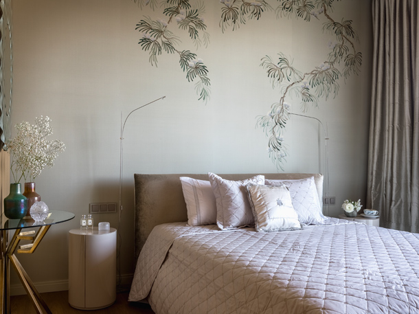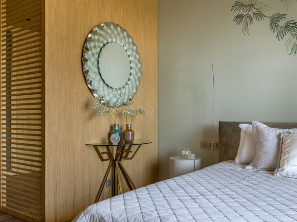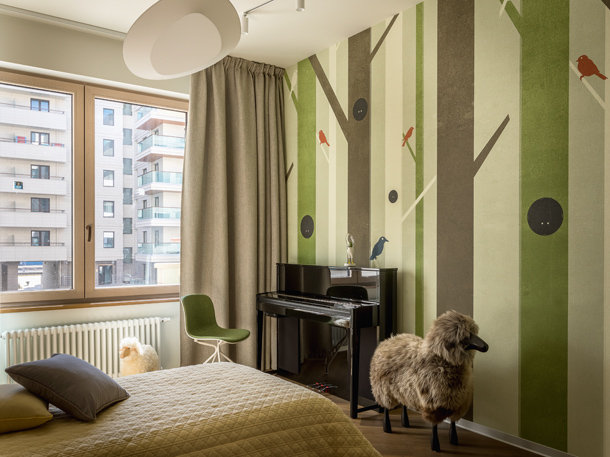 Природную линию продолжили и в приватных комнатах хозяев и детей. Как и в гостиной, в интерьерах использовали дерево, натуральные цвета и орнаменты. Серо-оливковые стены одной из детских сочетали с зеленым, серым и горчичным, а лаконичную современную обстановку дополнили более расслабленными по своему образу креслом, кроватью и круглой люстрой. Вторая комната для детей с зеленым стилизованным лесом на одной из стен украшена оригинальным стеллажом в виде дерева и симпатичными пуфами-овечками. Хозяйская ванная, отделанная серым мрамором, превратилась в затерянный горный источник, а в воздухе спальни, кажется, навсегда сохранился свежий аромат зелени и цветов.