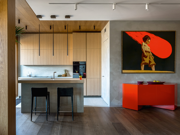 Столь же цельно и органично смотрится кухня. Высокие шкафы от пола до потолка воспринимаются единым пятном благодаря лаконичному дизайну дверец без ручек. Ощущение цельной композиции создает и перекличка материалов: кухонные фасады и столешница барной стойки, примыкающей к острову, выполнены в том же оттенке, что и деревянные панели на стенах и потолке.