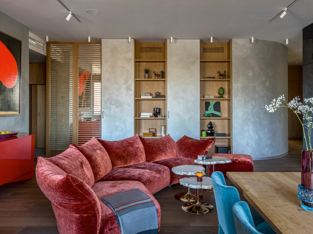 геометрии линий, архитекторы внесли мягкость и естественность с помощью полукруглой стены с извивающимся, как тропинка, коридором и дивана изогнутой формы. Столь же гармоничным здесь кажется и журнальный столик, изготовленный из слэбов камня с необработанными, неровными боковинками.