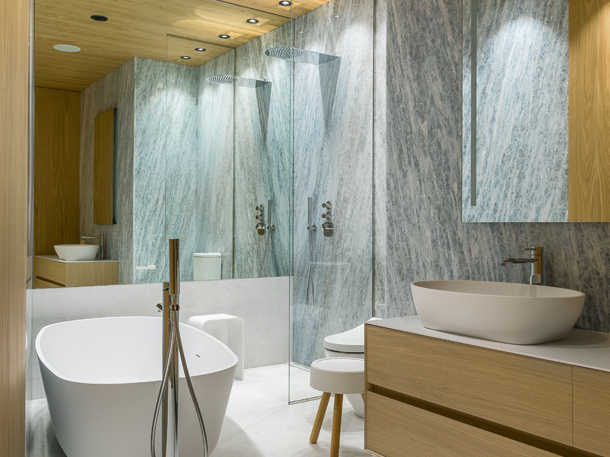 Умение «лепить» объемы, выстраивать ритм пространства, не забывая о паузах и пустотах, – отличительная черта студии. Здесь авторы сконцентрировались на гигантских вертикальных линиях от пола до потолка, которые мерно и ритмично дробят поверхности. Гладкие, пустые плоскости серых оштукатуренных стен сменяются полками встроенных стеллажей или деревянными панелями, в которых растворяются скрытые двери. В гостиной это чередование панелей из камня, а также черного стекла и зеркала, которые отражают интерьер и