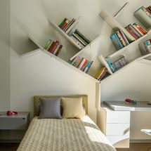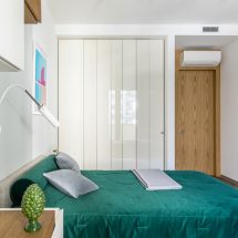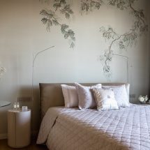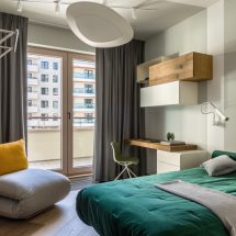 Природную линию продолжили и в приватных комнатах хозяев и детей. Как и в гостиной, в интерьерах использовали дерево, натуральные цвета и орнаменты. Серо-оливковые стены одной из детских сочетали с зеленым, серым и горчичным, а лаконичную современную обстановку дополнили более расслабленными по своему образу креслом, кроватью и круглой люстрой. Вторая комната для детей с зеленым стилизованным лесом на одной из стен украшена оригинальным стеллажом в виде дерева и симпатичными пуфами-овечками. Хозяйская ванная, отделанная серым мрамором, превратилась в затерянный горный источник, а в воздухе спальни, кажется, навсегда сохранился свежий аромат зелени и цветов.