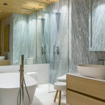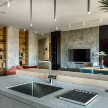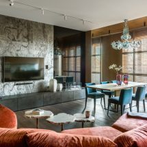 Умение «лепить» объемы, выстраивать ритм пространства, не забывая о паузах и пустотах, – отличительная черта студии. Здесь авторы сконцентрировались на гигантских вертикальных линиях от пола до потолка, которые мерно и ритмично дробят поверхности. Гладкие, пустые плоскости серых оштукатуренных стен сменяются полками встроенных стеллажей или деревянными панелями, в которых растворяются скрытые двери. В гостиной это чередование панелей из камня, а также черного стекла и зеркала, которые отражают интерьер и