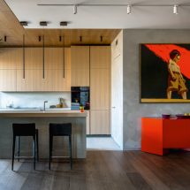 Столь же цельно и органично смотрится кухня. Высокие шкафы от пола до потолка воспринимаются единым пятном благодаря лаконичному дизайну дверец без ручек. Ощущение цельной композиции создает и перекличка материалов: кухонные фасады и столешница барной стойки, примыкающей к острову, выполнены в том же оттенке, что и деревянные панели на стенах и потолке.