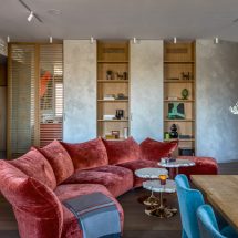 геометрии линий, архитекторы внесли мягкость и естественность с помощью полукруглой стены с извивающимся, как тропинка, коридором и дивана изогнутой формы. Столь же гармоничным здесь кажется и журнальный столик, изготовленный из слэбов камня с необработанными, неровными боковинками.