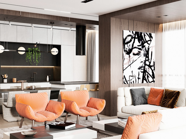 Когда общее настроение будущего дизайна стало понятно, пришло время поиска стилевого направления, которое наилучшим образом выразит все задуманное. Идеальным вариантом оказался современный лаконичный стиль, наполненный контрастом геометрии и текстур, а также яркими цветовыми акцентами.