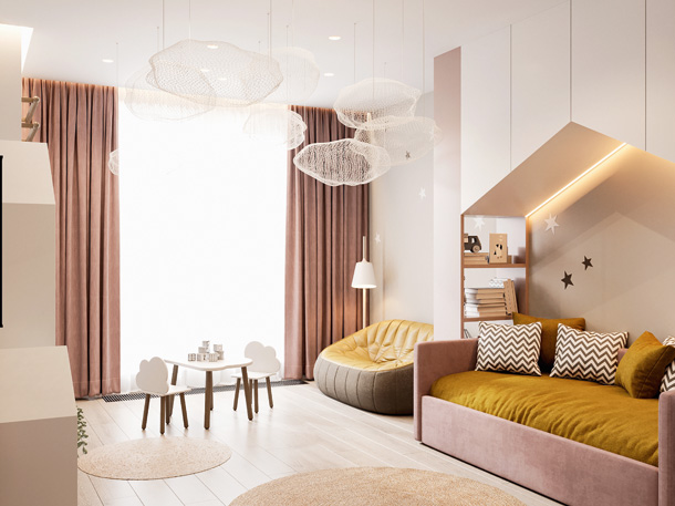 Детская комната для младшей дочери – отличный пример того, как можно сочетать милые, игривые детали, которые так нравятся детям, и лаконичность, изысканный стиль, который будет в числе прочего воспитывать в них хороший вкус. Декоративные облака под потолком, звезды на стенах, стеллажи в виде домиков – все это создает ощущение своего собственного сказочного пространства, в котором ребенку так интересно играть! Почти вся мебель для этой комнаты была разработана и выполнена индивидуально по эскизам дизайнера.