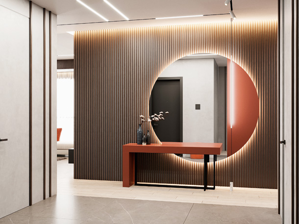 Особое внимание в этом проекте уделено первому впечатлению, образу, который остается в памяти надолго. Когда речь идет о жилом пространстве, такую эмоцию мы получаем уже на входе в квартиру, то есть во входной зоне. Именно дизайн прихожей должен задавать тон и настроение, разжигать желание увидеть больше. Пожалуй, в данном случае эффект был достигнут в полной мере, ведь в интерьере прихожей сконцентрированы все ключевые особенности этого уникального жилья. Планировка устроена таким образом, что из входной зоны и холла пространство плавно перетекает в зону кухни-гостиной. И уже при входе в квартиру мы видим, какая эстетика нас здесь ждет: обилие натурального дерева в отделке, теплые, словно обволакивающие тона, яркие акценты, сложный многоуровневый свет и, конечно, смелая геометрия.
