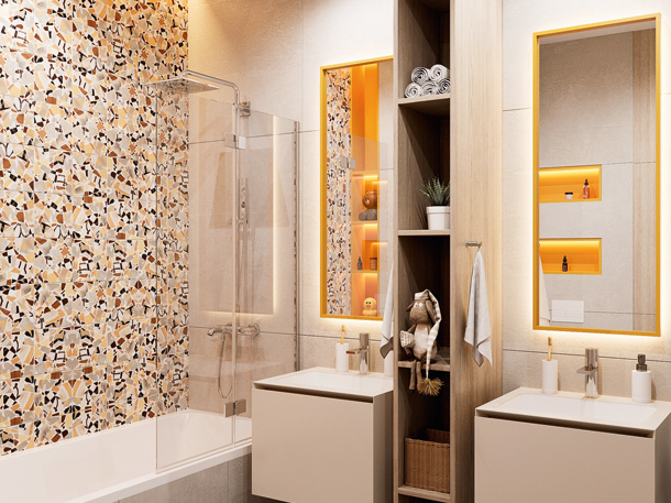 Для детской ванной комнаты был выбран фоновый широкоформатный керамогранит в бежевом цвете, который дополнен плиткой «терраццо», выложенной над ванной. Ярко-желтый акцентный цвет разбавляет однотонную плитку. Интересно обыгран стояк канализации между двумя раковинами: его закрыли мебельной конструкцией и в результате получили открытые полки для хранения ванных принадлежностей и детских игрушек.
