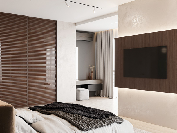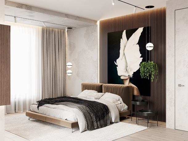 Благодаря сочетанию контрастных по текстуре материалов и принципу асимметрии интерьер мастер-спальни получился графичным, но вместе с тем мягким. Ламели на стене за изголовьем кровати задают динамику и ритм, они также перекликаются с раздвижными реечными дверями, ведущими в гардеробную.