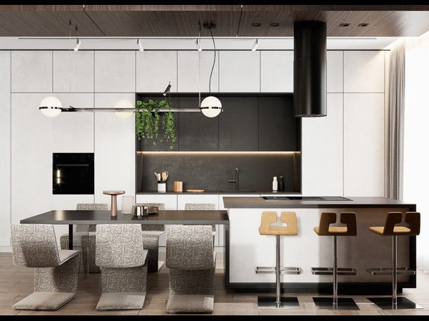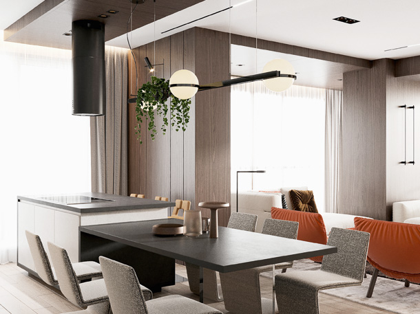 Кухня и гостиная образуют единое пространство, которое разделяет на две смысловые зоны лишь уверенная линия, словно проведенная в плоскости барной стойкой и обеденным столом. Кухня минималистичного дизайна, на кухонном острове расположились варочная поверхность и барная стойка. Встроенная бытовая техника, отсутствие лишней фурнитуры, закрытые системы хранения – все это позволяет сделать дизайн кухонной зоны более лаконичным, чтобы не отвлекать внимание от главного – красоты простых форм и выразительности мягкой цветовой палитры.