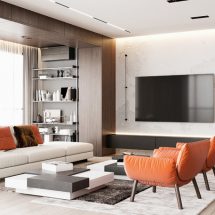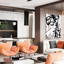 Простая, но такая изысканная комбинация серых, коричневых, бежевых оттенков продолжена и в гостиной зоне. Однако здесь также появляются яркие акценты в виде кресел с оранжевой обивкой. Вкупе с удобным, вместительным диваном они образуют единую композицию зоны отдыха, места, где приятно проводить уютные вечера с семьей и друзьями.