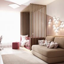 Оформление детских зон также всегда проходит в тесном сотрудничестве с маленькими «заказчиками», ведь важно сделать пространство не только удобным и практичным, но и полностью отвечающим представлению малышей о прекрасном. В этой семье две девочки, и детских комнат также две. Цветовую гамму для своих комнат сестры выбирали самостоятельно: старшая отдала предпочтение розово-сиреневой палитре с активным включением яркого ягодного оттенка, а детскую младшей решено было оформить в приглушенном розовом тоне с добавлением мягкого желтого и бежевого тонов.