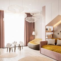 Детская комната для младшей дочери – отличный пример того, как можно сочетать милые, игривые детали, которые так нравятся детям, и лаконичность, изысканный стиль, который будет в числе прочего воспитывать в них хороший вкус. Декоративные облака под потолком, звезды на стенах, стеллажи в виде домиков – все это создает ощущение своего собственного сказочного пространства, в котором ребенку так интересно играть! Почти вся мебель для этой комнаты была разработана и выполнена индивидуально по эскизам дизайнера.