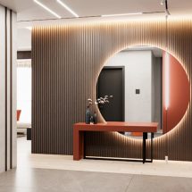 Особое внимание в этом проекте уделено первому впечатлению, образу, который остается в памяти надолго. Когда речь идет о жилом пространстве, такую эмоцию мы получаем уже на входе в квартиру, то есть во входной зоне. Именно дизайн прихожей должен задавать тон и настроение, разжигать желание увидеть больше. Пожалуй, в данном случае эффект был достигнут в полной мере, ведь в интерьере прихожей сконцентрированы все ключевые особенности этого уникального жилья. Планировка устроена таким образом, что из входной зоны и холла пространство плавно перетекает в зону кухни-гостиной. И уже при входе в квартиру мы видим, какая эстетика нас здесь ждет: обилие натурального дерева в отделке, теплые, словно обволакивающие тона, яркие акценты, сложный многоуровневый свет и, конечно, смелая геометрия.