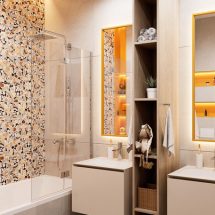 Для детской ванной комнаты был выбран фоновый широкоформатный керамогранит в бежевом цвете, который дополнен плиткой «терраццо», выложенной над ванной. Ярко-желтый акцентный цвет разбавляет однотонную плитку. Интересно обыгран стояк канализации между двумя раковинами: его закрыли мебельной конструкцией и в результате получили открытые полки для хранения ванных принадлежностей и детских игрушек.