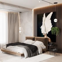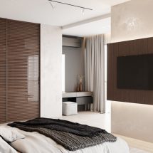 Благодаря сочетанию контрастных по текстуре материалов и принципу асимметрии интерьер мастер-спальни получился графичным, но вместе с тем мягким. Ламели на стене за изголовьем кровати задают динамику и ритм, они также перекликаются с раздвижными реечными дверями, ведущими в гардеробную.