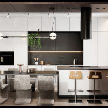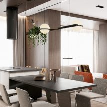 Кухня и гостиная образуют единое пространство, которое разделяет на две смысловые зоны лишь уверенная линия, словно проведенная в плоскости барной стойкой и обеденным столом. Кухня минималистичного дизайна, на кухонном острове расположились варочная поверхность и барная стойка. Встроенная бытовая техника, отсутствие лишней фурнитуры, закрытые системы хранения – все это позволяет сделать дизайн кухонной зоны более лаконичным, чтобы не отвлекать внимание от главного – красоты простых форм и выразительности мягкой цветовой палитры.