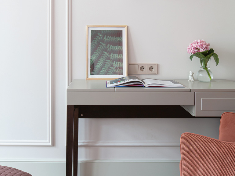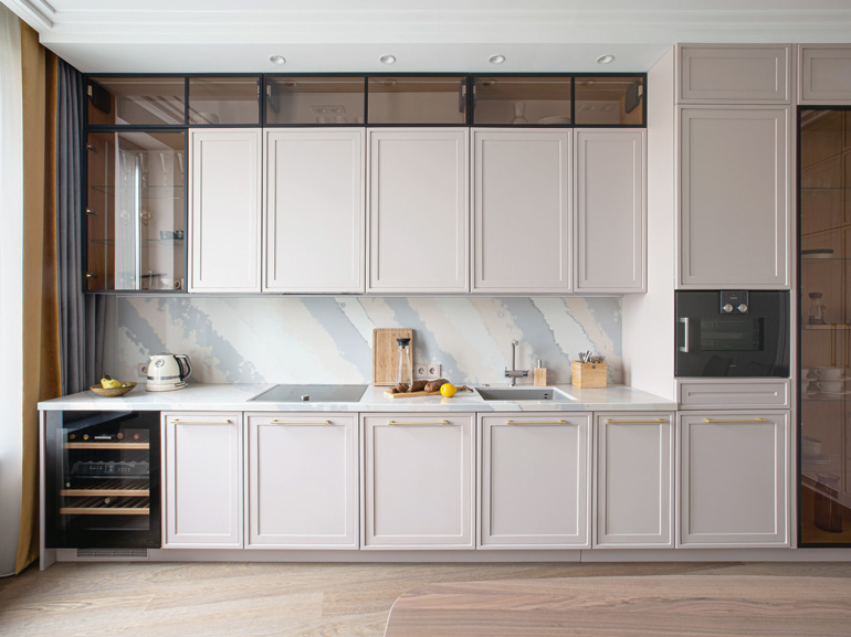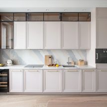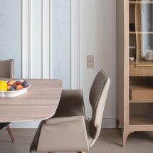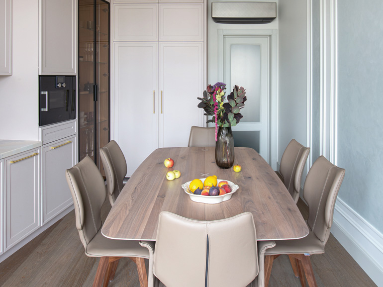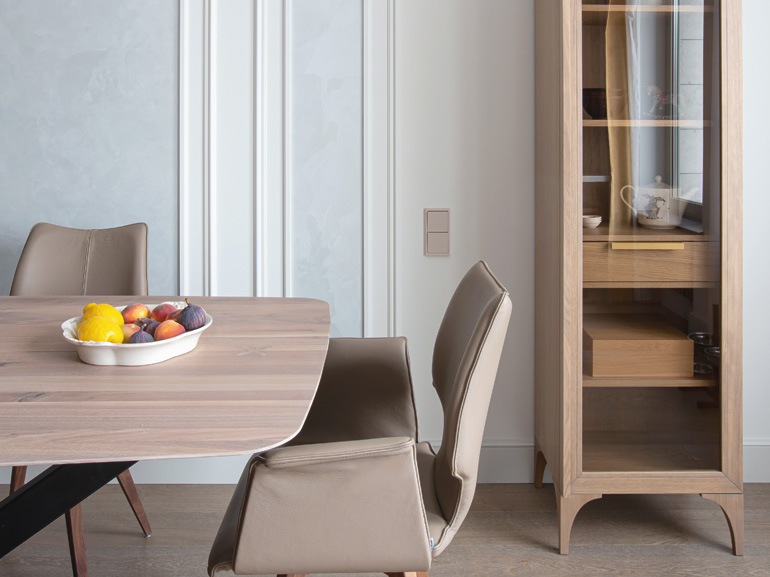 Элементы неоклассики заметнее играют в столовой, которая оформлена в спокойных, матовых оттенках нюда. Филенчатые фасады гарнитура рифмуются с трей-потолком, ниша которого отсылает к классическому кессону. Паркетная доска объединяет классические и неоклассические мотивы, создавая целостность строгого ритмического фона – базовую мелодию дизайна квартиры.