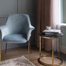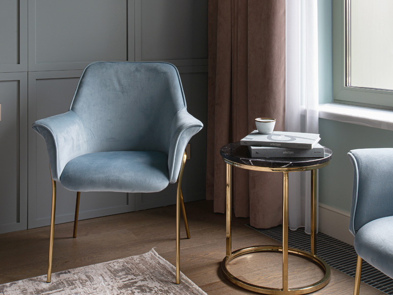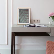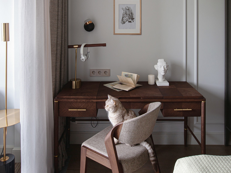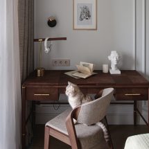Через фокусные точки интерьера в игру вступает модернизм mid-сentury – элементы стиля середины прошлого века, несущие атмосферу неприкосновенности домашнего очага и тихого комфорта. Мягкая мебель с деревянными подлокотниками и глубокие чашеобразные кресла выстраивают лейтмотив органических форм на основном фоне строгой ритмичной классики. В гостиной и кабинете стилистически перекликаются функциональные столы-бюро. На кухне классическую облицовку гарнитура обрамляют стеклянные элементы фасада – дань смелой стилистике 1950-х годов. Свобода форм и приспособление их к требованиям обитателей жилища проявляется и в ванной комнате – в лаконичной группе овальной раковины на деревянной тумбе, в мягких линиях скругленных зеркал. Функционализм зрелого модернизма – минимум места и максимум пользы – подчеркивает каркасная мебель в рабочей зоне.