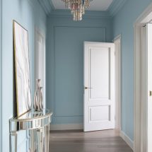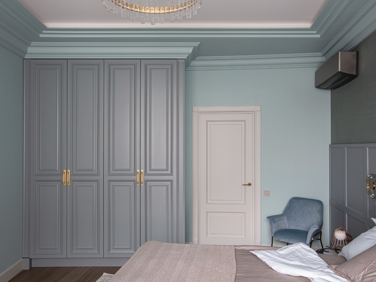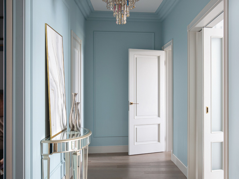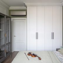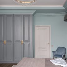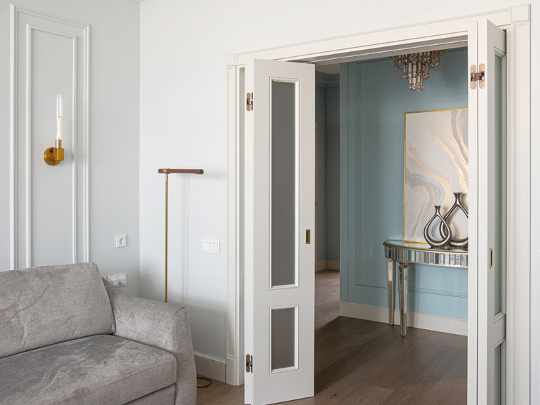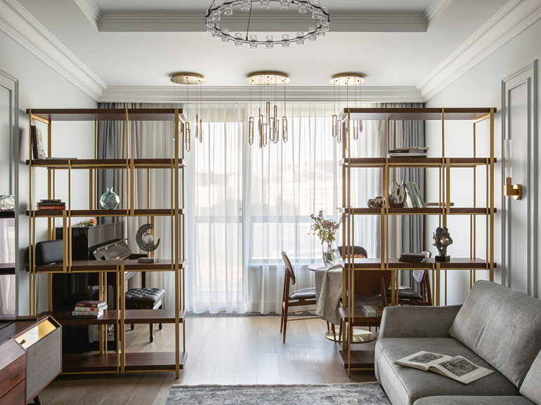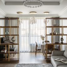 Особенность специалистов студии – умение выстраивать единый ритм пространства, гармонизируя планировку квартиры и ее наполнение. Здесь в основу дизайна лег принцип минимализма с использованием классических форм. Выдержанная строгая геометрия создает единство дизайна: параллелизм вертикальных молдингов в столовой, спальне и рабочих зонах подчеркивает четкий и мерный ритм, создавая ощущение незыблемости домашнего очага. Такая организация визуального ритма позволяет дизайнерам удачно встроить мебель в общую панораму квартиры: высокие шкафы вторят гармонии параллелизма, оставляя основное пространство комнат открытым и распахнутым к окнам с панорамным остеклением.