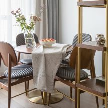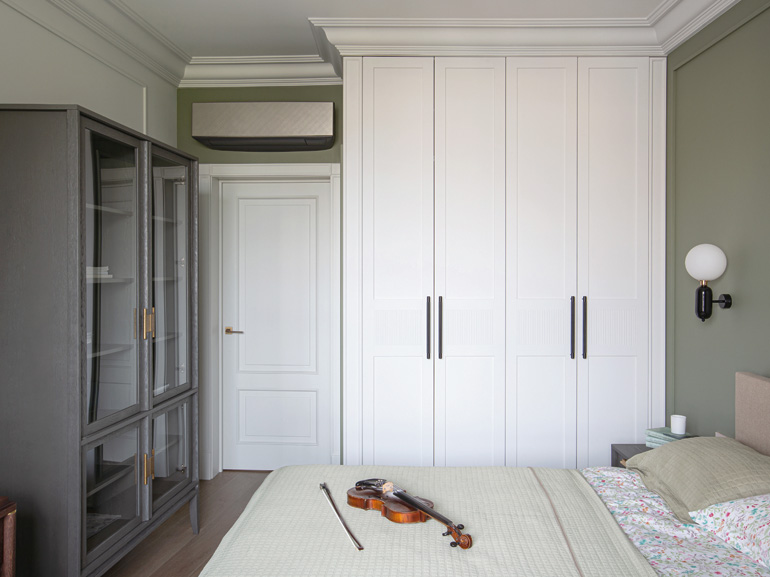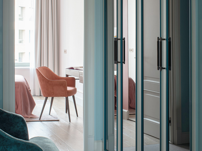 Гармонизирующее начало классики, модернизма и японских мотивов в этой квартире кроется в колористике. Дизайнеры заимствовали из каждого стиля самые характерные цвета, удачно объединив их в одной гамме. Прохладные оттенки холла и гостиной – пастельный бирюзовый и зеленый опал – отсылают к скандинавским элементам, свойственным mid-сentury и наиболее ярко выраженным в типичном северном хюгге. Нюдовый и оливково-коричневый цвета столовой продолжают классическую линию, сформулированную строгой геометрией базовых пространственных форм. Приглушенные серо-голубые тона спальни варьируют основную гамму джапанди, а теплые оттенки зеленого и персикового в детской объединяют всю палитру квартиры в ее смягченном варианте.