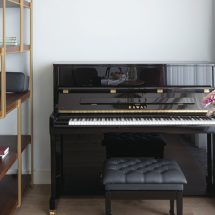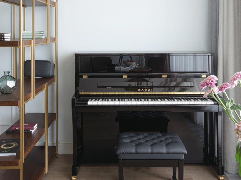 Джапанди нашел выражение и в зонировании пространства квартиры. Выделение музыкального уголка с фортепиано в гостиной с помощью каркасной витрины напоминает классический ход японского дизайна – зонирование ширмами. В этом случае легкий стеллаж с элементами геометрических форм, словно воздушная тонкая перегородка, отделяет интимный мир творчества от светской части комнаты.