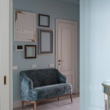 Пустые однотонные поверхности оштукатуренных стен чередуются с интерьерными группами – функциональными точками разного назначения. Кабинетные зоны встраиваются в общий ритм, в то же время сохраняя исключительность своего микропространства. Мягкий диван цвета темного изумруда служит центром композиции входной группы, а пуф того же тона – визуальным мотивом, развивающим тему домашнего уюта в рамках ритмической строгости классического дробления пространства. Потолочные ниши продолжают эту стратегию, подчеркивая основной ритм и в то же время образуя уютные, домашние «очаги» света. В этом контексте особенно значимой деталью выступают гардеробные зеркала в прихожей: поддерживая базовую ритмику дизайна, они вместе с тем становятся дополнительными источниками инсоляции, расширяя пространство комнаты и дублируя в отражении теплые мотивы домашней атмосферы.