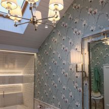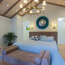 Мебель для этого проекта разрабатывалась индивидуально, с учетом архитектурных особенностей и дизайнерского оформления. Специалисты компании «Сотос-М» изготовили кровать и тумбы для мастер-спальни, поставили рейки и столярные панели для стен и потолков, приняли участие в оформлении кухни и санузлов на первом и втором этажах дома. Единый дизайн мебели и стеновых панелей также поддерживает целостную визуальную концепцию, воплощенную в сочетании неоклассики и кантри и разработанную в Meta Architects, от закладки фундамента до картин и зеркал на стенах.