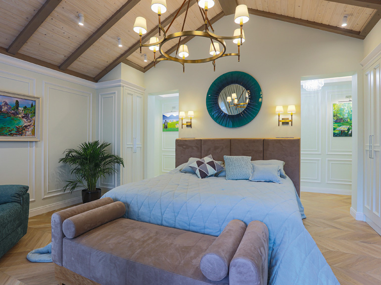 Второй этаж проектировался как интимное хозяйское пространство со всеми необходимыми зонами – спальней, гардеробом, санузлом и кладовкой. Центральное место здесь занимает просторная мастер-спальня площадью 20 кв. м с двусветными окнами, которые дают максимальную естественную инсоляцию. В приватной зоне неоклассика уступает место элементам уютного кантри, сохраняя за собой только ритмическое оформление стен вертикальными молдингами.
