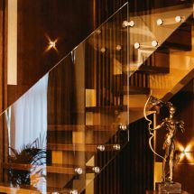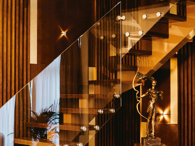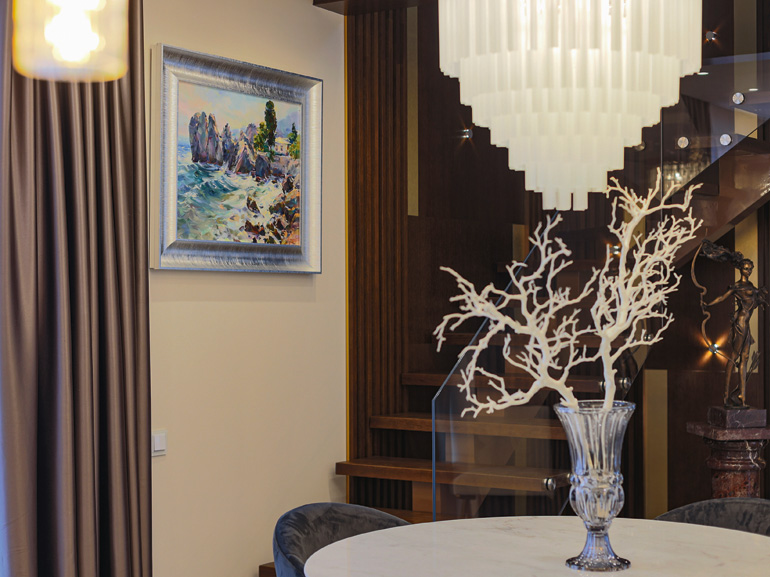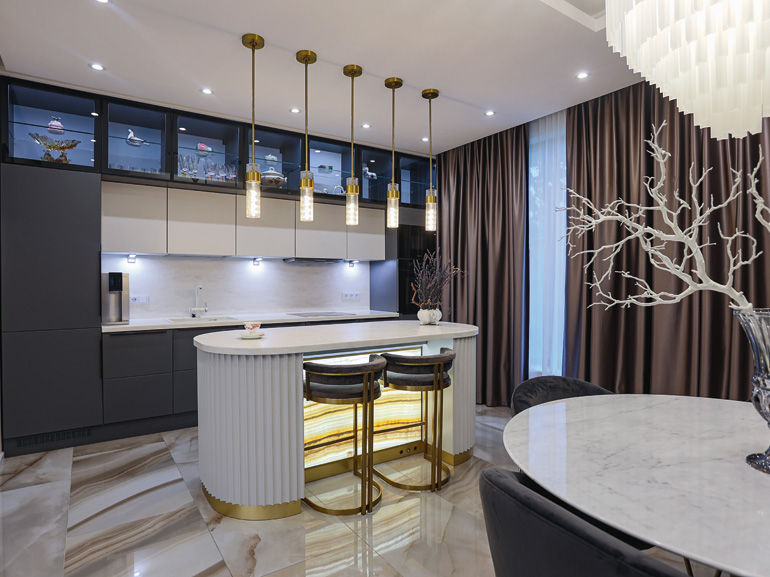 Дизайн интерьера первого этажа выдержан в строгих неоклассических формах, что отвечает функциональной задаче этих пространств как гостевой зоны. Вертикальные стеновые панели с каннелюрами и вариация на тему кессонов в оформлении потолочного освещения задают базовый ритм, который поддерживается строгой геометрией кухонного гарнитура и симметрией освещения кухонной зоны пятью латунными светильниками. Использование натуральных материалов – керамогранитных плит – в отделке пола подчеркивает сдержанную торжественность приемных комнат. Благородная фактура керамогранита визуально объединяет пространство, создавая фон для мебели и предметов интерьера.
