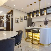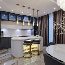 Мебель в гостиной и кухне-столовой также развивает мотивы неоклассики. Основание небольшого обеденного столика в кухонной зоне оформлено каннелюрами, пришедшими в современный дизайн интерьера от древнегреческих колонн. Многоступенчатая люстра в гостиной повторяет формы неоклассических светильников середины XX века. Неоклассическая ритмизация пространства находит завершение в текстиле – плотных матовых шторах, которые перекликаются со стеновыми панелями.