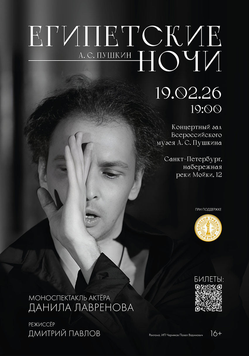 Артист театра и кино Данил Лавренов оживит текст «Египетских ночей» в историческом пространстве дома на набережной Мойки, 12. Здесь, где время замерло в 1837 году, встреча с загадочным и полным страсти произведением обещает стать особым, почти мистическим опытом.